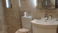 Reconfigured main bathroom with beige marble throughout, walk in shower, towel rail, underfloor heating and white sanitary ware